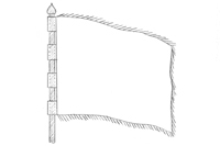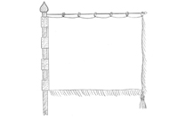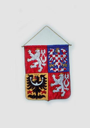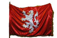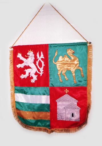 It is usually hung on a pole with a festive metal ending. Most common dimension is 50x60 cm with a satin or velvet fabric and fringes.